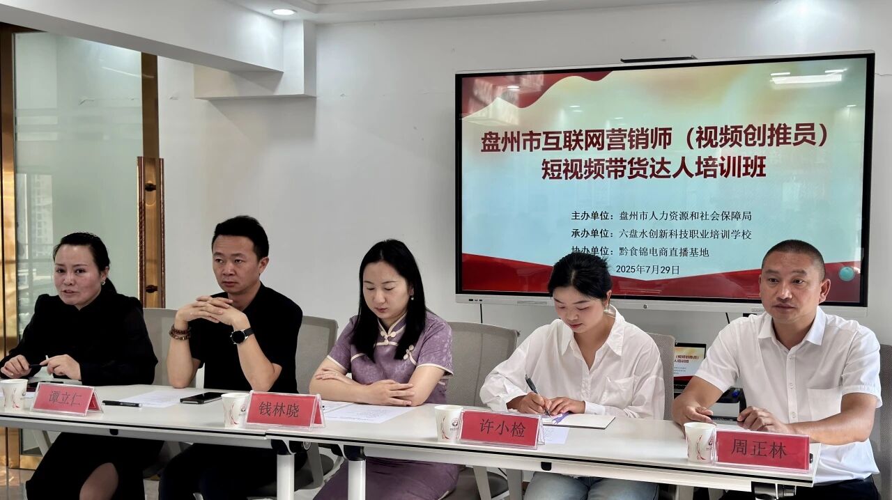 2025年7月29日,由盘州市人力资源和社会保障局指导、黔食锦电商直播基地协办、六盘水创新科技职业培训学校具体承办的盘州市第1期互联网营销师(视频创推员)培训班在黔食锦电商直播基地大会议室隆重开班。市就业局领导、基地负责人、培训教师及全体学员共44人出席开班仪式。