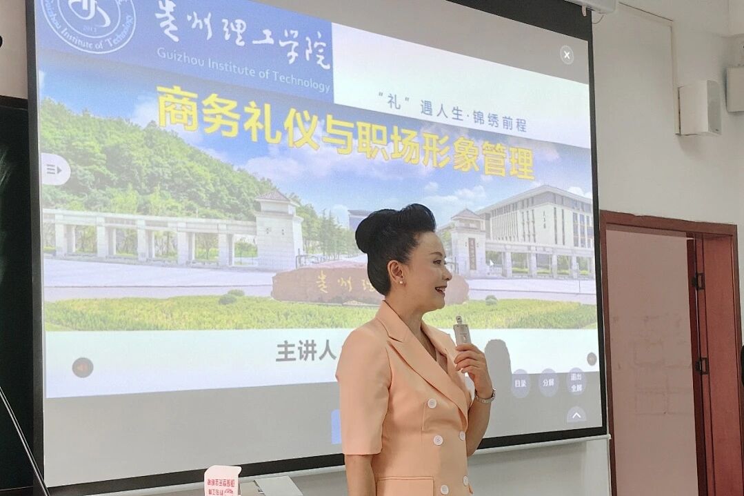 在贵州财经大学和贵州理工学院,高慕婵讲师采用理论讲解与场景模拟相结合的方式,重点培训商务形象礼仪(如仪容仪表TPOR原则、职业妆面与西装穿搭)、语言沟通礼仪(模拟商务通话演练)及商务活动礼仪(握手顺序、名片递送、乘车座次等)。通过互动情景演绎,帮助学生精准掌握职场规范。